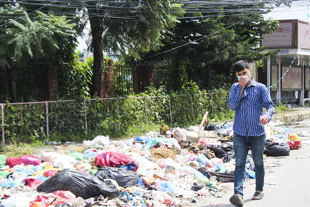 दुर्गन्धित काठमाडौंः सडकमा नाक थुनेर हिँड्दै एक सर्वसाधारण