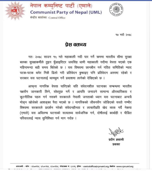 ‘आफ्नो नागरिक बेपत्ता पारिएको यति संवेदनशील घटनाका सम्बन्धमा भारतीय पक्षसँग जानकारी लिने, सोधपुछ गर्ने र आपत्ति जनाउने सामान्य औपचारिकता र कूटनीतिक पहल गर्न नसक्ने सरकारले नेपाली जनताको ध्यान यस घटनाबाट अन्यत्रै मोड्न खोजेको आशंका पैदा भएको छ’, ज्ञवालीले जारी गरेको विज्ञप्तिमा भनिएको छ ।