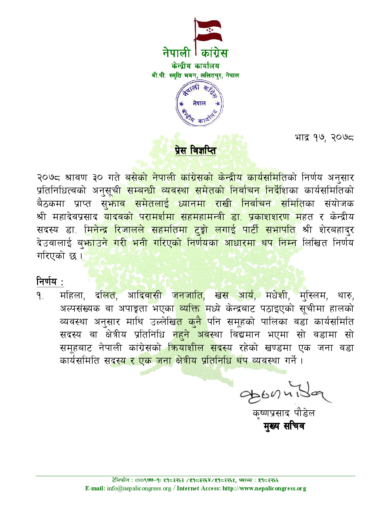 कांग्रेस मुख्य सचिव कृष्णप्रसाद पौडेलले एक विज्ञप्ति जारी गर्दै उक्त जानकारी गराएका हुन् ।