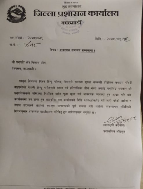 जिल्ला प्रशासन कार्यालय काठमाडौंले पशुपति क्षेत्र विकास कोषलाई आवश्यक स्वास्थ्य मापदण्ड पूरा गरेर मन्दिरमा पूजा गर्नका लागि खुला गर्न सकिने जनाएको छ। शुक्रबार जिल्ला प्रशासन कार्यालय काठमाडौंले विज्ञप्ति जारी गरी स्वास्थ्य मापदण्ड अपनाएर मन्दिरमा पूजाआजा गर्न सकिने जनाएको हो।