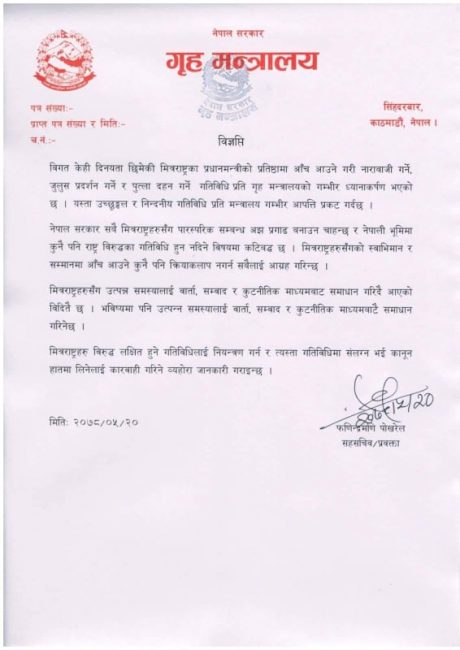 विज्ञप्तिमा भनिएको छ, ‘विगत केही दिनयता छिमेकी मित्रराष्ट्रका प्रधानमन्त्रीको प्रतिष्ठामा आँच आउने गरी नारावाजी गर्ने, जुलुस प्रदर्शन गर्ने र पुत्ला दहन गर्ने गतिविधिप्रति गृह मन्त्रालयको गम्भीर ध्यानाकर्षण भएको छ। यस्ता उच्छृङ्खल र निन्दनीय गतिवधि पति मन्त्रालय गम्भीर आपत्ति प्रकट गर्दछ।’