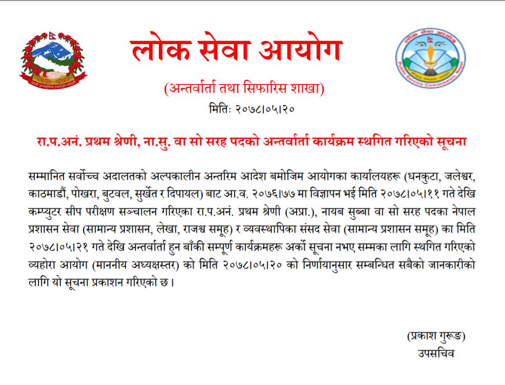 आयोग(अध्यक्ष स्तर)को निर्णयले धनकुटा, जलेश्वर, काठमाडौँ, पोखरा, बुटवल, सुर्खेत र दिपायलबाट आर्थिक वर्ष २०७६/०७७ मा विज्ञापन भई २०७८/०५/११ गतेदेखि कम्प्युटर सीप परीक्षण सञ्चालन गरिएको राजपत्र अनङ्कित प्रथम श्रेणी(अप्रा), नायब सुब्बा वा सो सरह पदका नेपाल प्रशासन सेवा(सामान्य प्रशासन, लेखा, राजश्व समूह) र व्यवस्थापिका संसद् सेवा(सामान्य प्रशासन समूह) का मिति २०७८/०५/२१ गतेदेखि अन्तर्वार्ता हुन बाँकी सम्पूर्ण कार्यक्रमहरू स्थगित गरेको हो ।