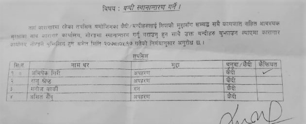 पत्रमा लेखिएको छ, ‘तहाँ (डिल्लीबजार) कारागारमा रहेका तपशील बमोजिमका कैदीबन्दीहरुलाई निजको मुद्दासँग सम्बद्ध सबै कागजातसहित आवश्यक सुरक्षाका साथ कारागार कार्यालय मोरङमा स्थानान्तरण गर्नु गराउनु हुन साथै उक्त बन्दी बुझाउन ल्याएमा कारागार कार्यालय मोरङले बुझिलिन हुन समेत मिति २०७८ भदौ १७ गतेको निर्णय अनुसार अनुरोध छ ।’