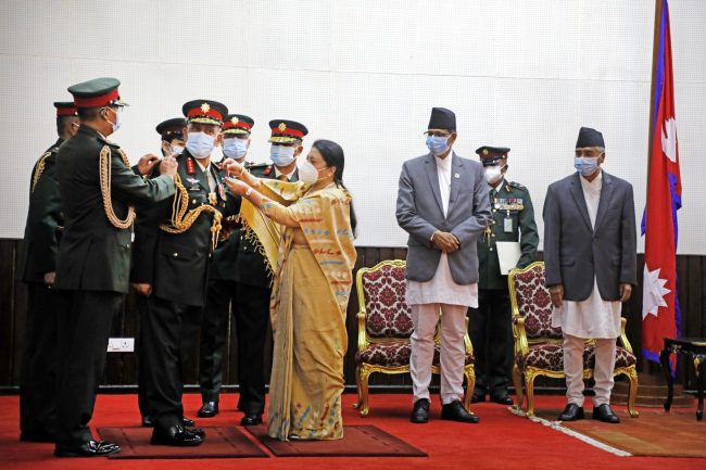 सपथअघि राष्ट्रपति भण्डारीले शर्मालाई प्रधानसेनापति पदको दर्ज्यानी चिन्ह लगाइदिएकी थिइन्।