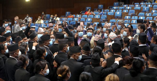 शुक्रबार दुई दुई पटक १५ मिनेटका लागि बैठक स्थगित गरियो । तेस्रो पटक बसेको बैठकमा भने एमाले सांसद र मर्यादापालकबीच रमाइलो घम्साघम्सी नै पर्यो । एमाले सांसद रेखा झाले माइक तानेर सभामुखलाई हिर्काउन खोजिन् । तर, उनलाई अन्य सांसद र मर्यादापालकले रोकेर दुर्घटनाबाट जोगाए ।