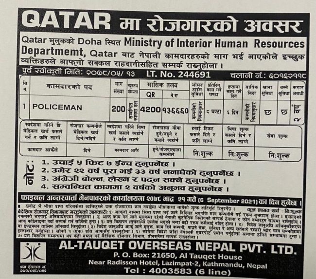 काठमाडौं । कतारस्थित नेपाली दुतावासले कतार प्रहरीका लागि पठाएको दुईसय जनाको माग रद्द गरेको छ । दूतावासले २९ अगस्ट २०२१ मा २ सय नेपालीलाई कतार प्रहरीमा भर्ना गर्ने गरी काठमाडौंको लाजिम्पाटस्थित अल ताक्वेत ओभरसिज नेपाल प्रालिका नाममा गरेको मागपत्र प्रमाणीकरणलाई रद्द गरेको हो ।
