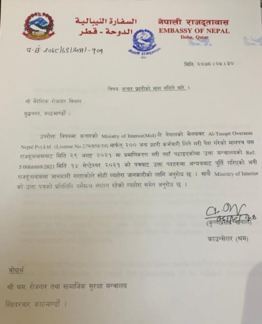 श्रम, रोजगार तथा सामाजिक सुरक्षा मन्त्रालयले कतार प्रहरीको माग श्रम संझौता अनुसार प्रमाणीकरण गर्न अनुमति दिएको केही दिनमै सो म्यानपावरले ल्याएको मागमा कतारको आन्तरिक मन्त्रालयले अन्यत्रबाटै पदपूर्ति भएकोले रद्द गरेको जनाएको छ ।