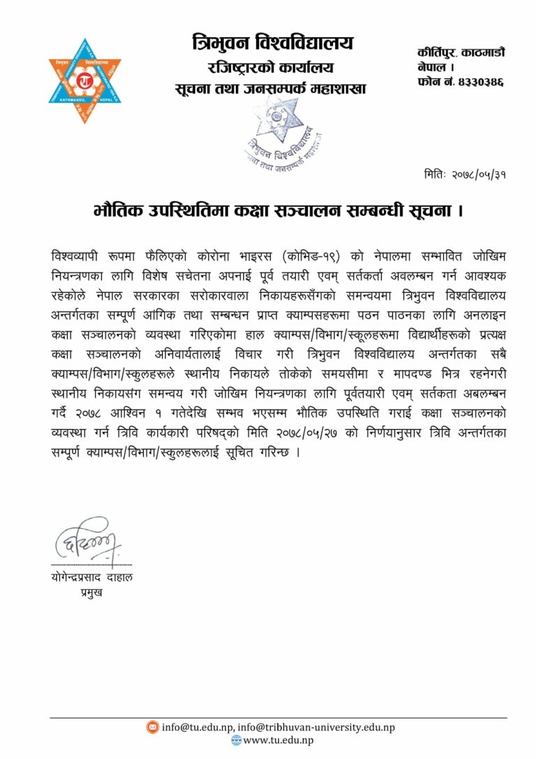 त्रिविले आंगिक तथा सम्बन्धन प्राप्त क्याम्पसहरुलाई कोरोना भाइरसको सम्भावित जोखिमलाई ध्यानमा राखेर असोज १ गतेबाट भौतिक रुपमा कक्षा सञ्चालन गर्न निर्देशित गरेको हो ।