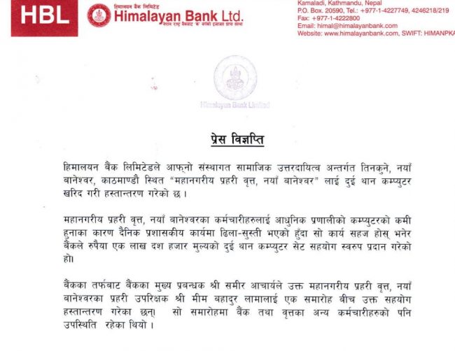 हिमालयन बैंकका मुख्य प्रवन्ध्क मीर आचार्यले प्रहरी उपरीक्षक मिमबहादुर लामालाई कम्प्यूटर हस्तान्तरण गरेका हुन्। बैंकका कार्मचारी र वृत्तका अन्य कर्मचारीको उपस्थितिमा कम्प्यूटर हस्तान्तरण गरेको बैंकले विज्ञप्तिमा उल्लेख गरेको छ।