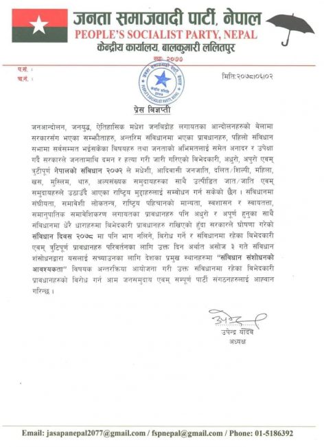 “संविधानमा रहेका विभेदकारी एवम् त्रुटिपूर्ण प्रावधानहरू परिवर्तनका लागि उक्त दिन अर्थात् असोज ३ गते संविधान संशोधनद्वारा यसलाई सच्याउनका लागि देशका प्रमुख स्थानहरूमा ‘संविधान संशोधनको आवश्यकता’ विषयक अन्तरक्रिया आयोजना गरी उक्त संविधानमा रहेका विभेदकारी प्रावधानहरूको विरोध गर्न आम जनसमुदाय एवम् सम्पूर्ण पार्टी संगठनहरूलाई आह्वान गरिन्छ,” अध्यक्ष उपेन्द्र यादवद्वारा शनिबार जारी विज्ञप्तिमा भनिएको छ ।