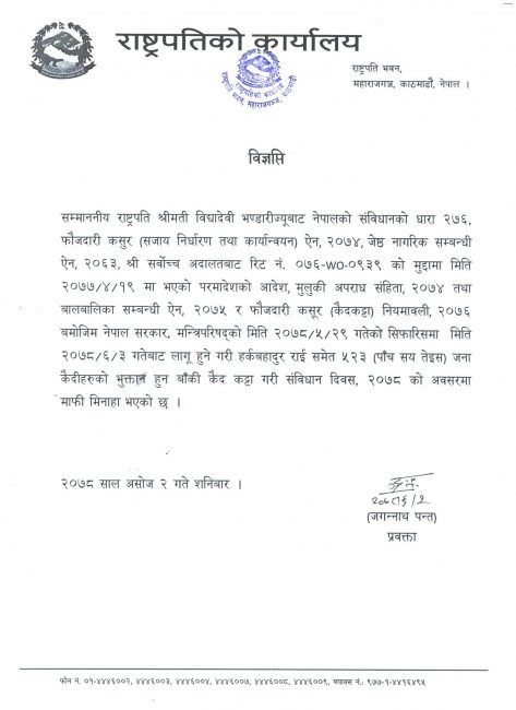 आइतबार देखि लागू हुने गरी ५२३ जना कैदीहरुको भुक्तान हुन बाँकी कैद कट्टा गरिएको राष्ट्रपति कार्यालयद्वारा विज्ञप्तिमा उल्लेख छ ।