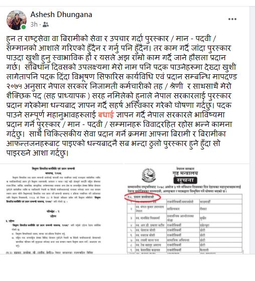 डा ढुंगानाले फेसबुकमा लेखेका छन्, “पदक पाउने सम्पूर्ण महानुभावहरूलाई बधाई ज्ञापन गर्दै नेपाल सरकारले भाविष्यमा प्रदान गर्ने पुरस्काररमानरपदवीरसम्मानहरू विवादरहित रहोस भन्ने कामना गर्दछु। साथै चिकित्सकीय सेवा प्रदान गर्ने क्रममा आफ्ना बिरामी र बिरामीका आफन्तजनहरूबाट पाइएको धन्यवाद नै सबैभन्दा ठुलो पुरस्कार हुने हुँदा सो पाइरख्ने आशा गर्दछु।’