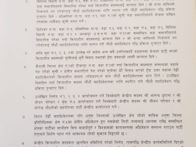 धनुषा प्रतिनिधि सभा निर्वाचन क्षेत्र–४ को वट्टेश्वर नगरपालिका–५, क्षिरेश्वर नगरपालिका–१० मा नयाँ क्रियाशील सदस्यता स्थगन गरिएको छ। त्यस्तै मिथिला बिहारी नगरपालिका–६ र १०, लक्ष्मीनिया गाउँपालिका –१ र २ मा वडा सभापतिले सिफारिस गरेकालाई मात्रै मान्यता दिने सहमति भएको छ। क्षिरेश्वर नगरपालिका–७, लक्ष्मीनिया गाउँपालिका–३, ४, ५ र ६, मिथिला बिहारी नगरपालिका–२ र जनकपुर उपमहानगरपालिका–१९ मा वडा सभापतिले सिफारिस गरेका क्रियाशील सदस्यहरुले मात्रै मान्यता पाउने भएका छन्।