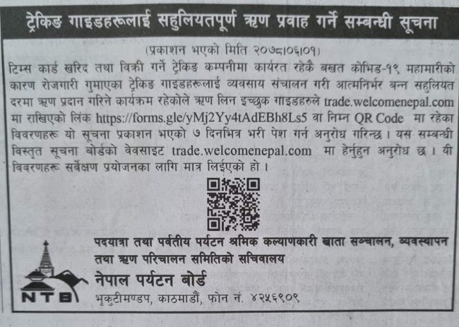 पर्यटन बोर्डले कोरोना महामारीले बेरोजगार बनेका ट्रेकिङ गाइडहरुका लागि सहुलियतपूर्ण ऋण लिन ७ दिनको समय तोकी आवेदन खुल्ला गरेको थियो । सो आवेदन फारम भर्ने अन्तिम मिति आज (बुधबार)सम्म रहेको छ ।