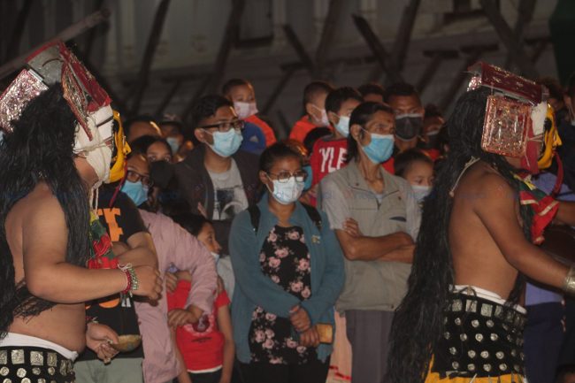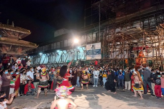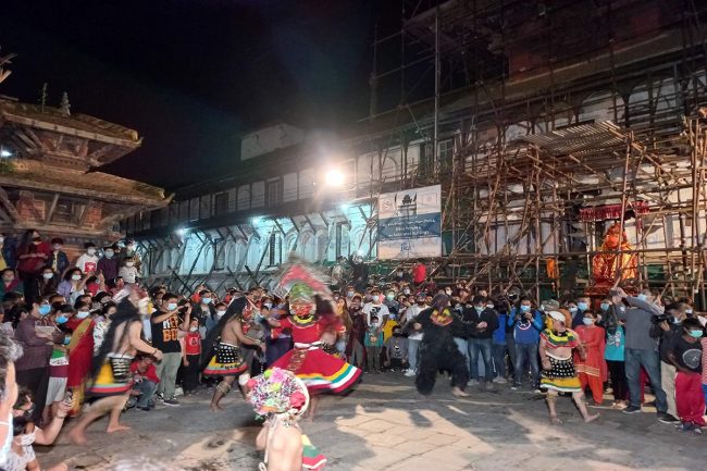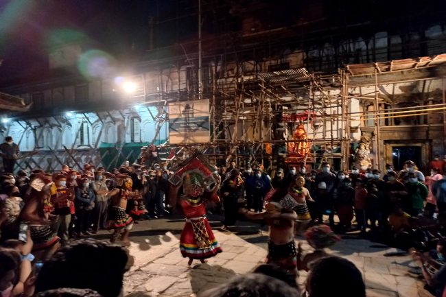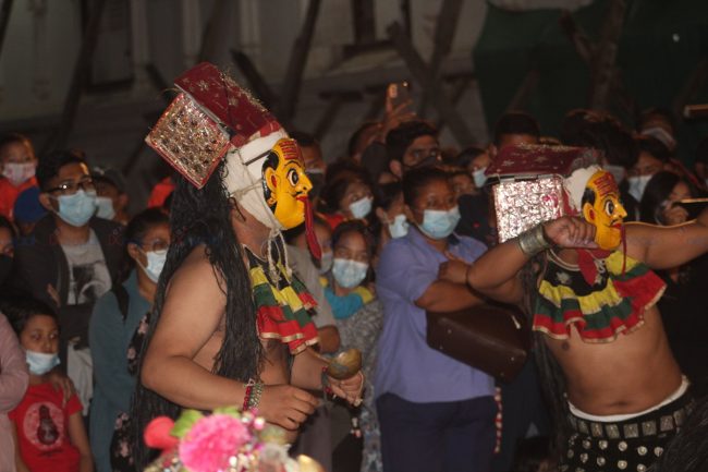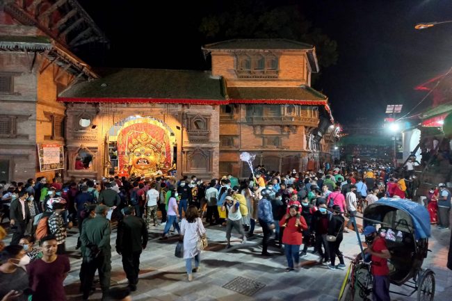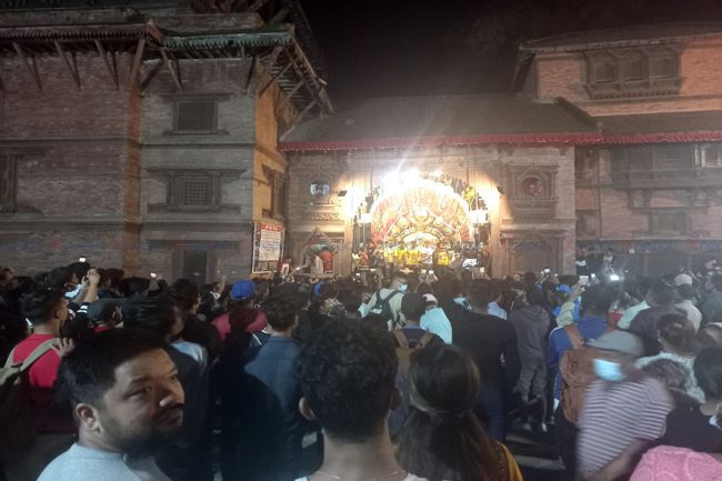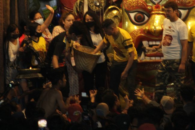 काठमाडौं । हनुमानढोकाको श्वेत भैरवको मुखबाट खसालिने प्रसाद बुधबार राति पुरूषहरूलाई खुवाइएको छ। आठदिन लामो इन्द्रजात्राको अवधिभर हरेकदिन साँझ पूजापछि श्वेत भैरवको मुखमा राखेको पाइपबाट प्रसाद स्वरूप जाँड रक्सी खसाल्ने गरिन्छ। मंगलबार रातिको प्रसाद खान महिलाहरूको भिड लागेको थियो।