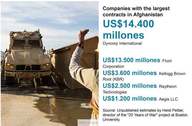 अमेरिका र अन्य देशका १०० भन्दा धेरै कम्पनीहरुलाई अफगानिस्तानमा सबै किसिमका सेवाहरुको लागि अमेरिकी रक्षा मन्त्रालयले ठेक्का दिएको थियो । यीमध्ये केही कम्पनीले अरबौं डलर पनि कमाए । ‘२० इयर्स अफ वार’ प्रोजेक्टकी निर्देशक हेदी पेल्टियर ‘कस्ट अफ वार’ प्रोजेक्टकी पनि सदस्य हुन् । उनले बीबीसी मुंडोलाई बताएअनुसार कुन कम्पनीलाई सबैभन्दा धेरै फाइदा भयो भन्ने प्रस्ट पार्ने कुनै आधिकारिक तथ्यांक छैन । तर, उनले प्रोजेक्टको अनुमान बीबीसीसँग साझा गरिन् जुन अनुमान अहिलेसम्म प्रकाशित भएको छैन ।