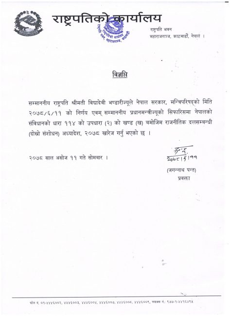 राष्ट्रपति भण्डारीद्वारा राजनीतिक दलसम्बन्धी अध्यादेश खारेज