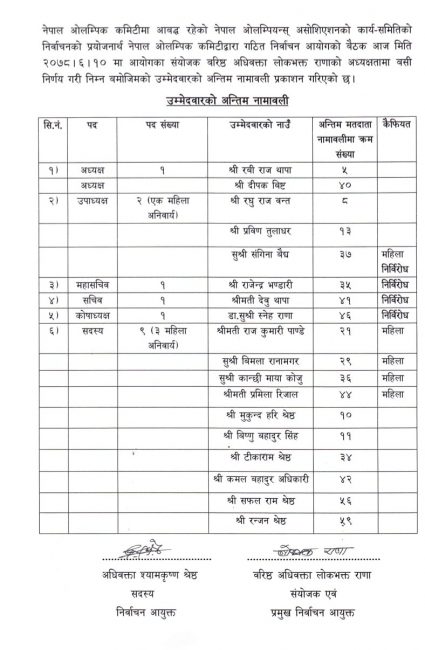 नेपाल ओलम्पिक कमिटी (एनओसी) मा आबद्ध ओलम्पियन्स संघमा उपाध्यक्ष, महासचिव, सचिव र कोषाध्यक्ष भने निर्विरोध चयन भइसकेको छ । महिला उपाध्यक्षमा संगिना वैद्य, महासचिवमा राजेन्द्र भण्डारी, सचिवमा देवु थापा र कोषाध्यक्षमा स्नेहा राणा निर्विरोध चयन भएका हुन् ।