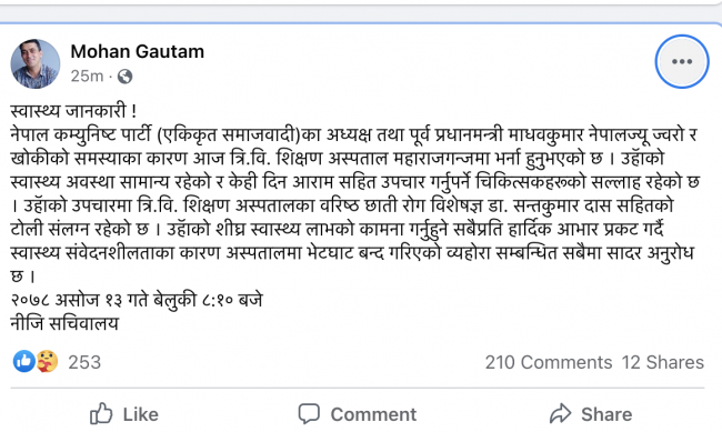 भाइरल ज्वरो र खोकीको कारण स्वास्थ्यमा समस्या आएपछि महाराजगञ्जस्थित शिक्षण अस्पतालमा स्वास्थ्य परीक्षणका लागि गएका उनी भर्ना भएका हुन ।