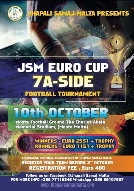 JSM EUROCUP २०२१ (7-साइड फुटबॉल टूर्नामेन्ट) को नाममा उक्त टूर्नामेन्ट Mosta फुटबल ग्राउन्ड मा आयाेजना हुने भएकाे छ। अध्यक्ष श्री तेज बहादुर लिम्बु र कार्यक्रमका मुख्य संयोजक श्री भुवन झाले माल्टामा नेपाली संगठनले आयोजना गरेको यो अहिलेसम्मको सबैभन्दा ठूलो एकदिवसीय फुटबल प्रतियोगिता हुने बताएका छन्।