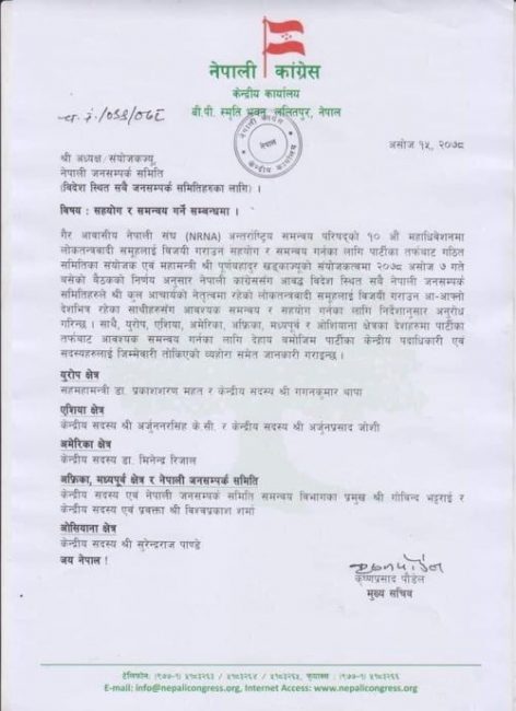 कांग्रेस केन्द्रीय कार्यालयका मुख्य सचिव कृष्णप्रसाद पौडेलले विदेशस्थित सबै जनसम्पर्क समितिका अध्यक्ष तथा संयोजकहरुलाई नेताहरुको नामावलीको सूचीसहित पत्राचार गरेका छन् । जनसम्पर्क समितिहरुलाई पठाइएको पत्रका अनुसार युरोप क्षेत्रमा सहमहामन्त्री डा. प्रकाशशरण महत र केन्द्रीय सदस्य गगनकुमार थापालाई जिम्मेवारी दिइएको छ । एसिया क्षेत्रमा केन्द्रीय सदस्यद्वय अर्जुननरसिंह केसी र अर्जुनप्रसाद जोशी छन् ।