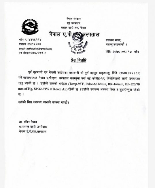काठमाडौं। नेपाली कांग्रेसका महामन्त्री पूर्णबहादुर खड्काको स्वास्थ्य अवस्था स्थिर तर सुधारोन्मुख रहेको नेपाल एपीएफ अस्पतालले जानकारी दिएको छ।