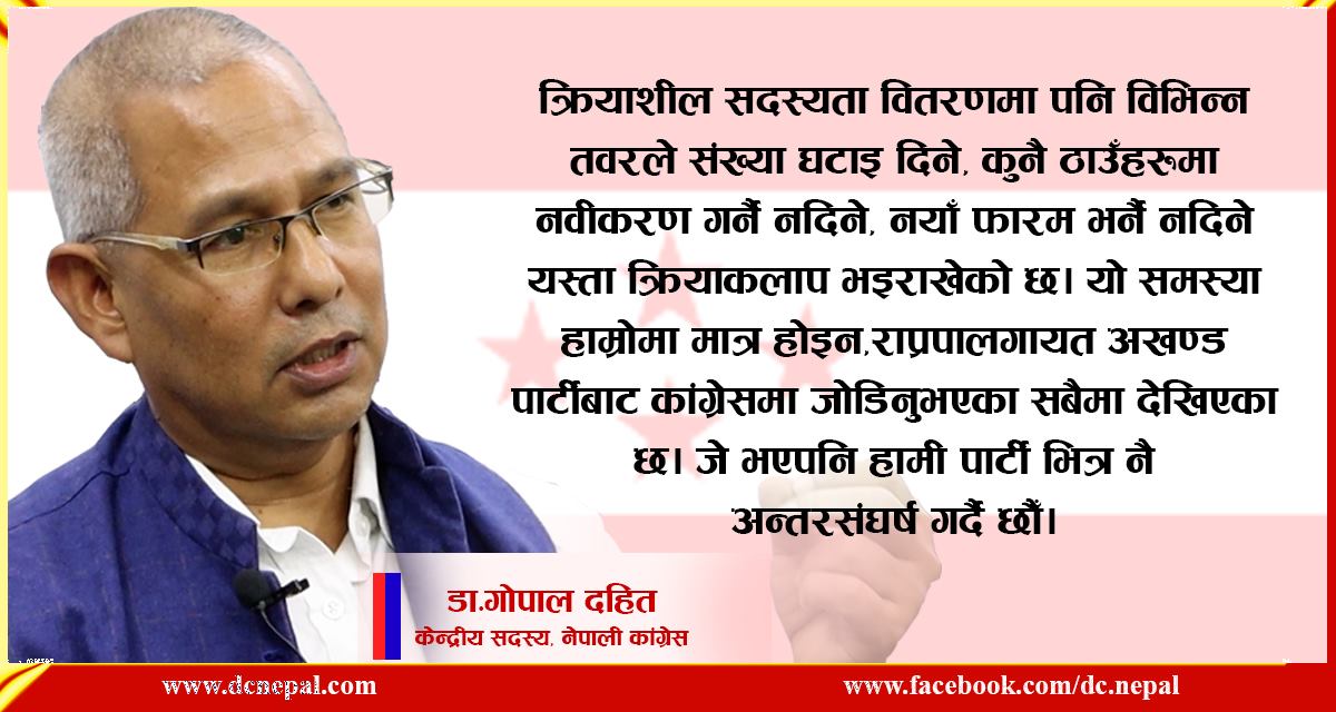 त्यसैगरी क्रियाशील सदस्यता वितरणमा पनि विभिन्न तवरले संख्या घटाइ दिने, कुनै ठाउँहरुमा नवकरण गर्नै नदिने, नयाँ फारम भर्नै नदिने यस्ता क्रियाकलाप भइराखेको छ। यो समस्या हाम्रोमा मात्र होइन,राप्रपालगायत अखण्ड पार्टीबाट कांग्रेसमा जोडिनुभएका सबैमा देखिएका छ। जे भएपनि हामी पार्टी भित्र नै अन्तरसंघर्ष गर्दै छौँ।