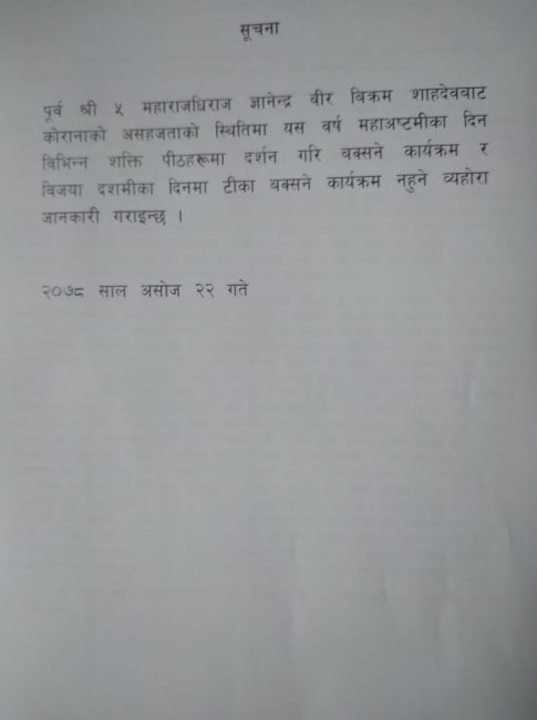 काठमाडौं । पूर्वराजा ज्ञानेन्द्र शाहले यस वर्षको दशैंमा सर्वसाधारणलाई टिका नलगाइदिने भएका छन् । कोरोनाका कारण पूर्वराजा शाहले अष्टमीको दिन शक्ति पिठहरुको दर्शन पनि नगर्ने शाहका स्वकीय सचिव फणिराज पाठकले जानकारी दिए ।