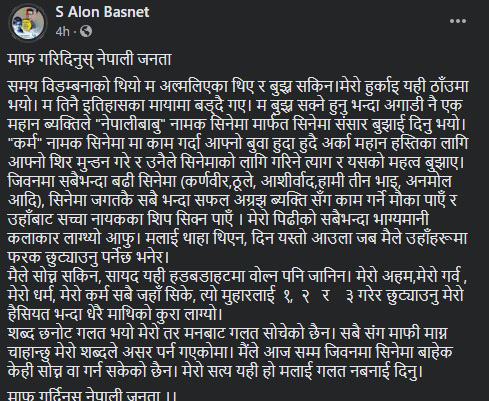मेरो अहं, मेरो गर्व, मेरो धर्म, मेरो कर्म सबै जहाँ सिकें त्यो मुहारलाई १, २ र ३ गरेर छुट्याउनु मेरो हैसियतभन्दा धेरै माथिको कुरा लाग्यो । शब्द छनोट गलत भयो मेरो तर मनबाट गलत सोचेको छैन । सबैसँग माफी माग्न चाहन्छु मेरो शब्दले असर पर्न गएकोमा । मैले आजसम्म जीवनमा सिनेमाबाहेक केही सोच्न वा गर्न सकेको छैन । मेरो सत्य यही हो, मलाई गलत नबनाइदिनु ।