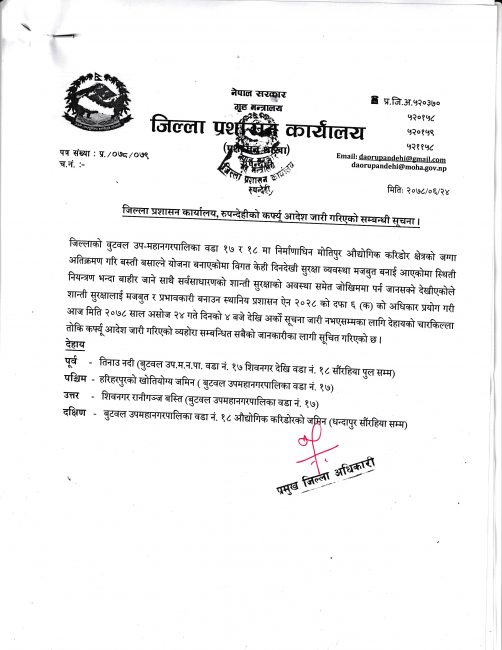 आइतबार ४ बजेदेखि अर्को सूचना जारी नहुन्जेलसम्मका लागि पूर्वमा तिनाउ नदी, पश्चिममा हरिहरपुरको खेती योग्य जमिन, उत्तरमा शिवनगर रानीगञ्ज वस्ती र दक्षिणमा बुटवल उपमहानगरपालिका १८ औद्योगिक करिडोरको जमिन रहेको भागसम्म लागू हुने गरी कर्फ्यु जारी गरिएको रुपन्देहीका प्रमुख जिल्ला अधिकारी ऋषिराम तिवारीले जारी गरेको सूचनामा उल्लेख छ ।