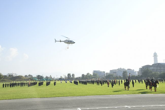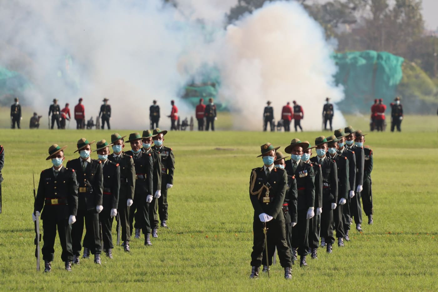 समारोहमा सैनिक हेलिकप्टरबाट पुष्पवृष्टि गरिनुुका साथै राइफल र तोपबाट लहरे एवं एकठ्ठा बढाइँ गरियो । त्यस अवसरमा इज्जत अर्पण कवाज, विभिन्न गुल्मद्वारा बढाइँ, मार्चपाससहितको बढाइँ र सैनिक ब्याण्डबाट मालश्री र दुर्गा स्त्रोत्रका धुन प्रस्तुत भयो ।