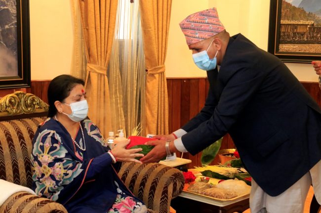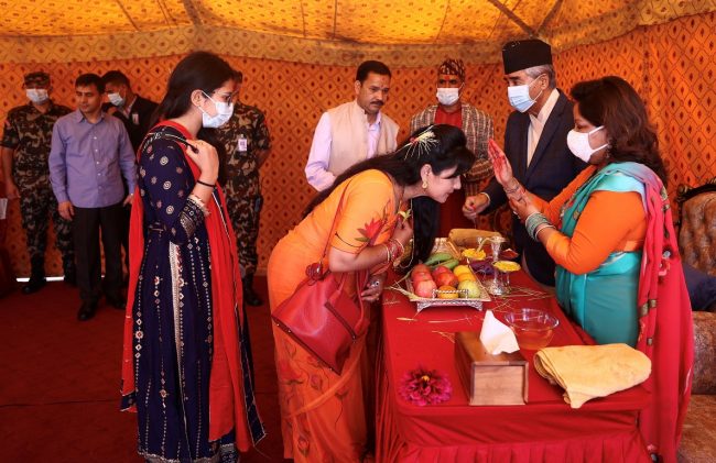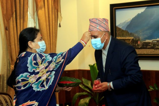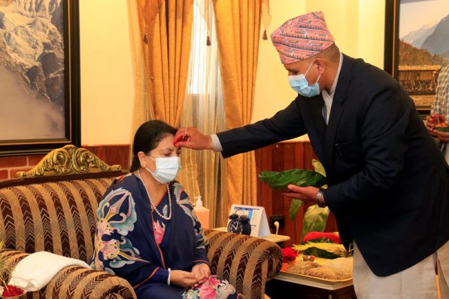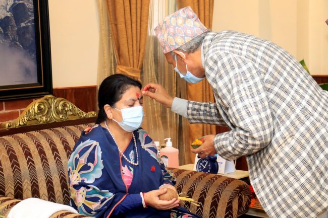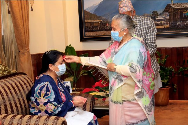 काठमाडौं । राष्ट्रपति विद्यादेवी भण्डारी र प्रधानमन्त्री शेरबहादुर देउवाले दसैंको टिका लगाएका छन्। राष्ट्रपति भण्डारीले आमाको हातबाट टिका ग्रहण गरेकी छिन् भने प्रधानमन्त्रीले आफन्तलाई लगाइ दिएका छन्।