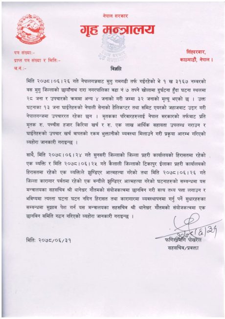 मन्त्रालयले जारी गरेको विज्ञप्तिमा भनिएको छ, ‘मृतकका परिवारहरुलाई नेपाल सरकारको तर्फबाट प्रति मृतक पच्चीस हजार किरिया खर्च र एक लाख आर्थिक सहायता उपलब्ध गराउन र घाईतेहरुको उपचार खर्च वापतको रकम भुक्तानीको व्यवस्था मिलाउने गरी प्रकृया आरम्भ गरिएको व्यहोरा जानकारी गराइन्छ।’
