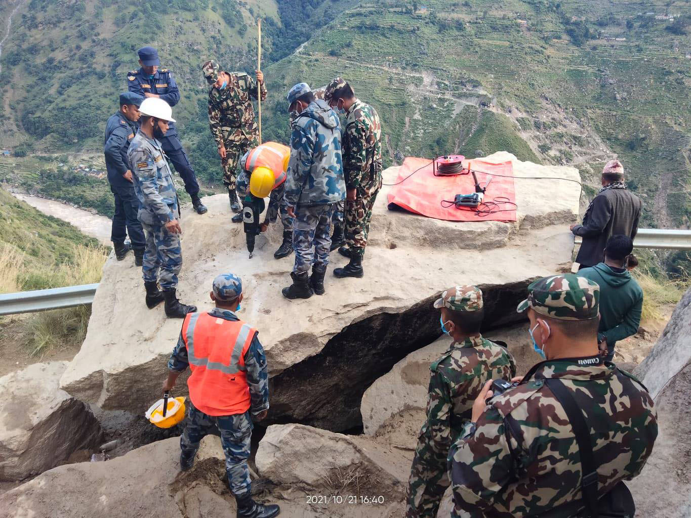 सडकमाथिबाट ठूलो ढुंगा खसेको र त्यो ढुंगा डोजर पन्छाउन नसकेपछि ड्रिल मेसिनद्वारा नेपाली सेना, सशस्त्र प्रहरी बल र नेपाल प्रहरीले विष्फोट गरेर ढुंगा फुटाई अवरुद्ध राजमार्ग खुलाइएको हो ।