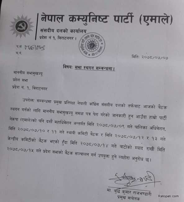 एमालेका प्रमुख सचेत बुद्धिकुमार राजभण्डारीले सभामुखलाई सम्बोधन गरी बुझाएको पत्रमा १५ कात्तिकसम्म प्रदेशसभा बैठक स्थगित गर्न माग गरिएको छ। यसअघि आइतबार नै कांग्रेसले पनि प्रदेशसभाको आइतबारको बैठक स्थगित गर्न माग गरेको थियो।