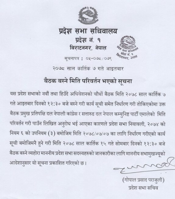 प्रदेश १ प्रदेशसभा बैठक कात्तिक १५ गतेसम्म स्थगित