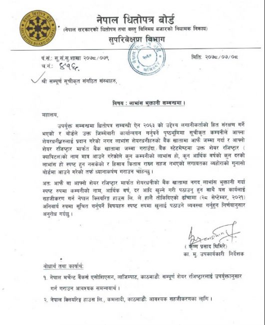 साथै, यस कार्यलाई सहजीकरण गर्न नेपाल क्लियरिङ्ग हाउसले हालै तोकिदिएको ढाँचामा (२८ सेप्टेम्बर, २०२१) अनिवार्य रूपमा सूचित गर्नुपर्ने विषयहरू स्पष्ट रूपमा खुलाई पठाउने व्यवस्था गर्न बोर्डले सम्बन्धित सूचीकृत कम्पनीहरूलाई जानकारी गराएको छ ।