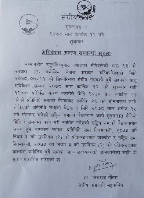 अन्ततः ४८ दिनमै संघीय संसदको दुवै सदनको अधिवेशन शुक्रबार मध्यराति १२ बजेबाट अन्त्य हुने जानकारी संसद सचिवालयले सांसदहरूलाई जानकारी गराएको छ ।