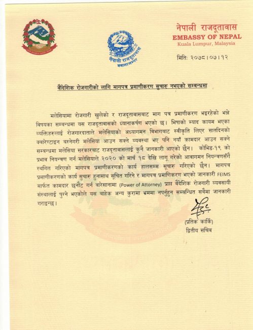सूचनाका अनुसार कोभिड–१९ को प्रभाव नियन्त्रण गर्न मलेसियाले २०२० मार्च १८ देखि लागु गरेको आवागमन नियन्त्रणसँगै स्थगित गरिएको मागपत्र प्रमाणीकरणको कार्य हालसम्म सुचारु गरिएको छैन । साथै, दूतावासले मागपत्र प्रमाणीकरणको कार्य सुचारु हुनासाथ सूचित गरिने जनाएको छ ।