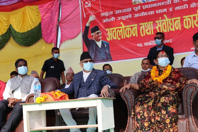 माडी नगरपालिका–९ अयोध्याधाममा अस्थायी मन्दिर निर्माण गरिएपछि पहिलो पटक ओलीले स्थलगत अवलोकन गरेका हुन् । अयोध्याधाममा ओलीलाई स्थानीयहरूले पुष्पगुच्छा र मालाले स्वागत गरेका छन् ।