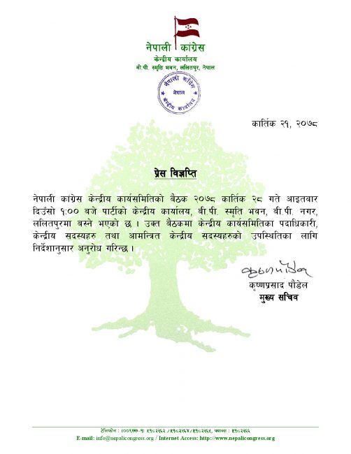 पार्टी कार्यालयका मुख्यसचिव कृष्णप्रसाद पौडेलले सूचना जारी गर्दै कात्तिक २८ गते दिउँसो १ बजे बस्ने केन्द्रीय कार्यसमिति बैठकमा पार्टी पदाधिकारी, केन्द्रीय सदस्य र आमन्त्रित सदस्यलाई बोलाएका छन् ।