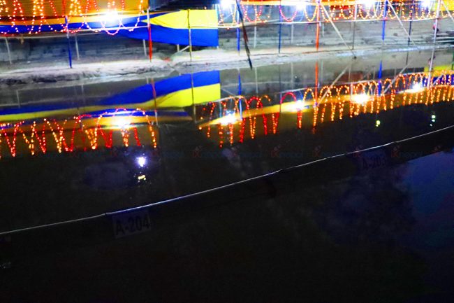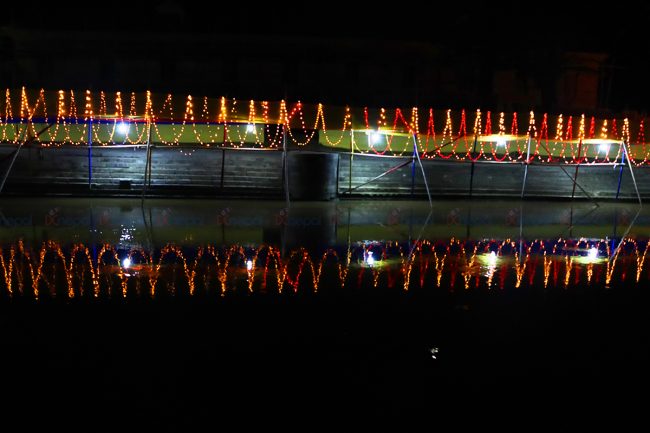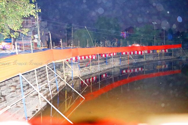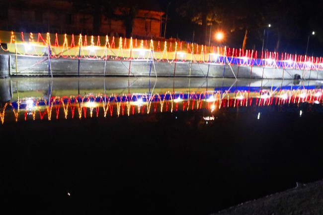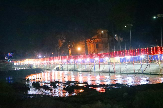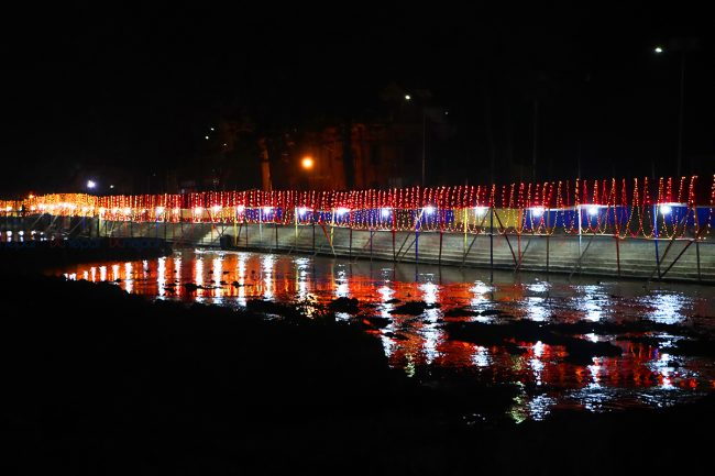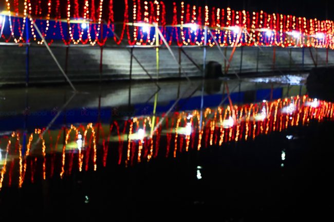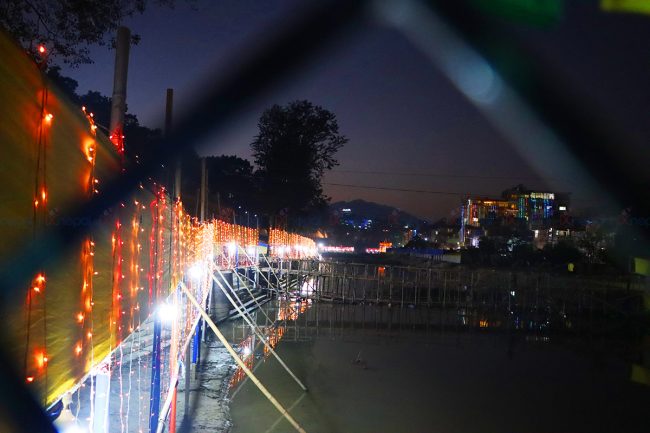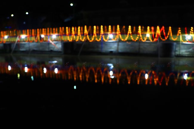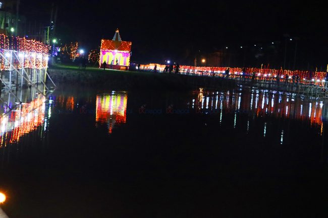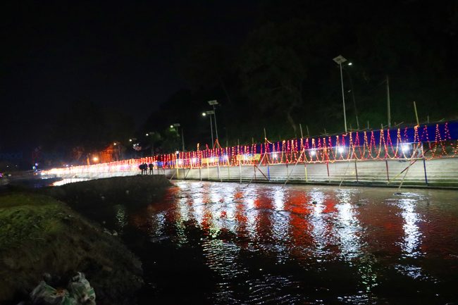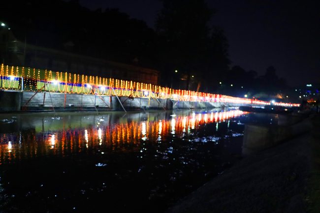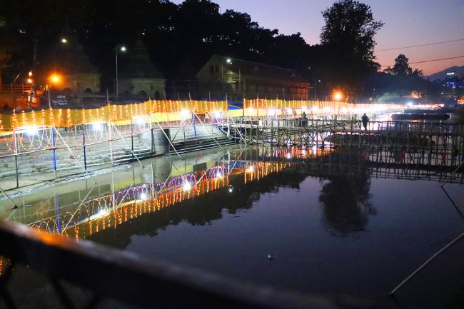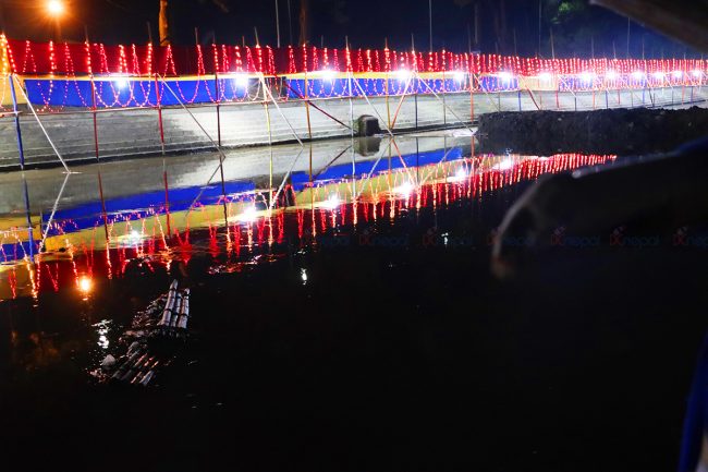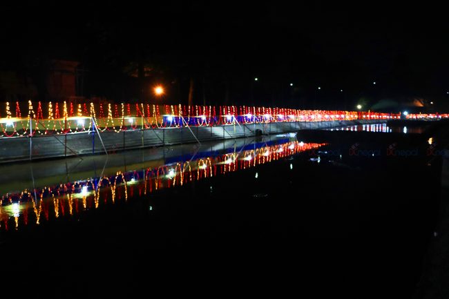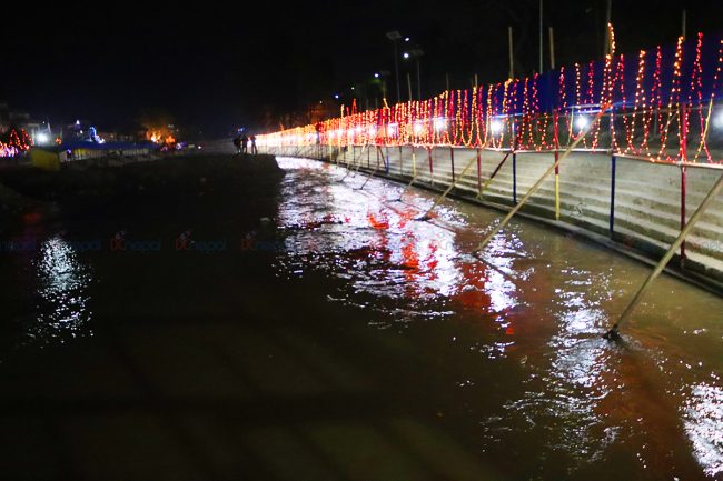 पश्चिम किनारामा लगाएका बत्तीहरूकाे प्रतिबिम्ब पानीमा परेकाे छ। जति जति रात छिप्पिँदै जान्छ बागमतीमा परेकाे बत्तीकाे प्रतिबिम्बले आफूलाइ उत्तिकै शसक्त रूपमा चम्काइरहेका हुन्छन्। सधैं धमिलाे देखिने बागमतीकाे पानी बत्तिहरूकाे प्रकाशमा धमिलाे पन हराएकाे पाइन्छ।