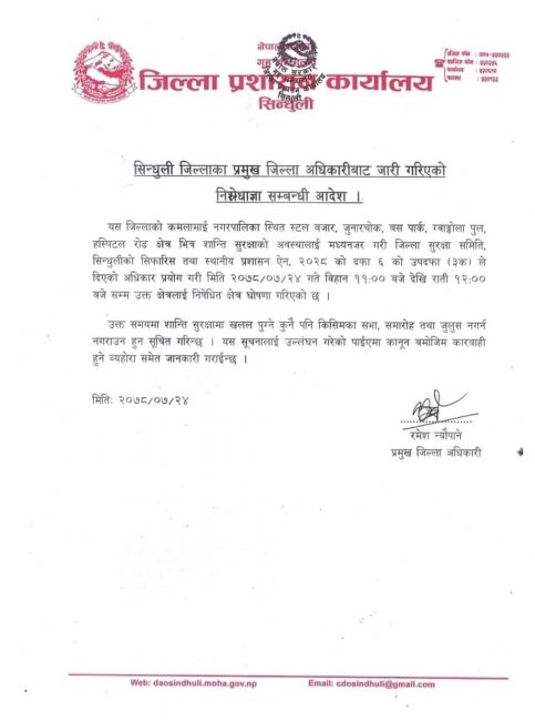 निषेधाज्ञा सिन्धुलीमाढीस्थित बसपार्क क्षेत्र, स्टलबजार, जुनार चोक, सिन्धुली अस्पताल आसपासको क्षेत्रमा जारी गरिएको प्रमुख जिल्ला अधिकारी रमेश न्यौपानेले जानकारी दिए।