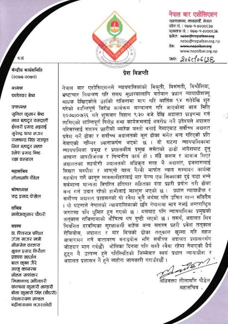प्रधानन्यायाधीश चोलेन्द्र शमशेर जबराको राजीनामाको माग दोहोर्‍याउँदै बारले अन्यथा बारको धैर्य टुट्न गई उत्पन्न हुने परिस्थितिको जिम्मेवार स्वयं प्रधानन्यायाधीश र अदालत प्रशासन नै हुने चेतवानी दिएको छ ।