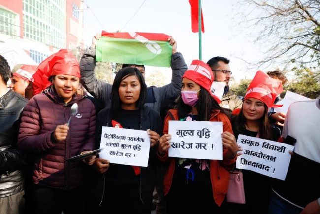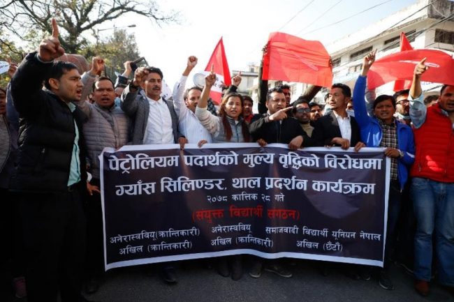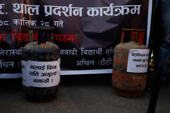 काठमाडौं । सरकारले पेट्रोलियम पदार्थमा बढाएको मूल्यवृद्धिको खारेजको माग गर्दै प्रदर्शन भएको छ । काठमाडौंमा विभिन्न दलनिकट विद्यार्थीहरूले प्रदर्शनीमार्गस्थित रत्नराज्यलक्ष्मी क्याम्पसबाट सिलिन्डर बोकेर प्रदर्शन गरेका हुन् ।