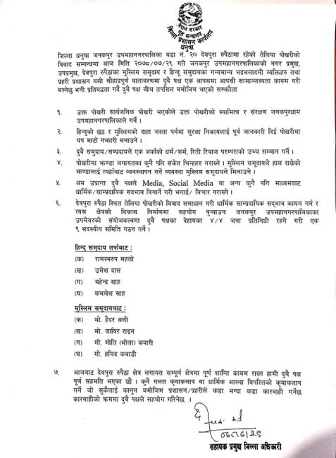 त्यसैगरी उक्त सहमति कार्यान्वय गराउन उपमहनगरपालिका उपमेयर रीताकुमारी मिश्रको संयोजकत्वमा दुवै समुदायबाट चार-चार जना प्रतिनिधि रहने गरी समितिसमेत गठन गरिएको छ ।