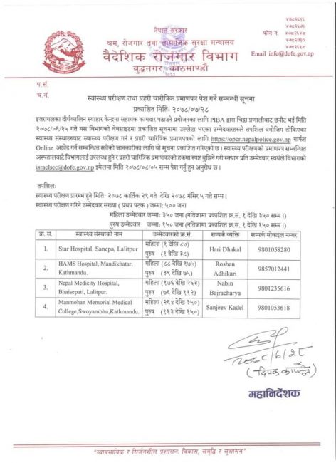 विभागले स्वास्थ्य परीक्षण प्रमाणको लागि ललितपुरस्थित सानेपाको स्टार अस्पताल, काठमाडौंस्थित मन्डिखाटारको ह्याम्स अस्पताल, ललितपुरस्थित भैसेपाटीको नेपाल मेडिसिटी हस्पिटल र काठमाडौंस्थित स्वयम्भूको मनमोहन मेमोरियल मेडिकल कलेजमा सम्पर्क गर्न आग्रह गरेको छ । विभागका अनुसार स्वास्थ्य परीक्षण कात्तिक २९ देखि मंसिर ५ गतेभित्र गरिसक्नुपर्नेछ ।