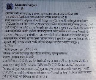 कैलालीको लम्कीचुहा नगरपालिकाका मेयर तथा एमालेका प्रदेश कमिटी सदस्य महादेव बजगाइँले सामाजिक सञ्जालमार्फत बुधबारका लागि महाधिवेशन प्रतिनिधि छनौट भेला आह्वान गरेका छन्। उनले कैलालीको लम्कीस्थित मनोहरा होटलमा भेला आयोजना गरेकाे सामाजिक सञ्जाल फेसबुकमा पोष्ट गरेका छन्।