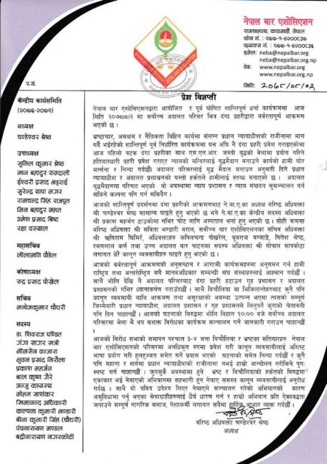 साथै बिहीबार अध्यक्ष चण्डेश्वर श्रेष्ठसहित कानुन व्यवसायी घाइते हुने गरी भएको घटनाको अनुगमन गर्न राष्ट्रिय मानवअधिकार आयोगलाई बारले आग्रह गरेको छ । प्रधानन्यायाधीश चोलेन्द्र शमशेर जबराको राजीनामा आफूहरूको निसर्त माग रहेको बारको भनाइ छ ।