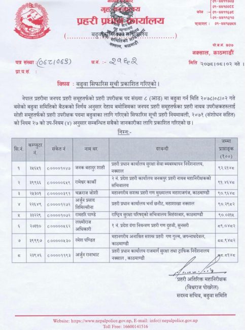 बढुवा समितिको बैठकले जनकबहादुर शाही, रामेश्वर कार्की, चक्रराज जोशी, अर्जुनप्रसाद तिमिल्सीना, रामहरि पाण्डे, लक्ष्मीराज अधिकारी, रमेश पण्डित र अर्जुन रानाभाटलाई बढुवामा सिफारिस गरेको हो।